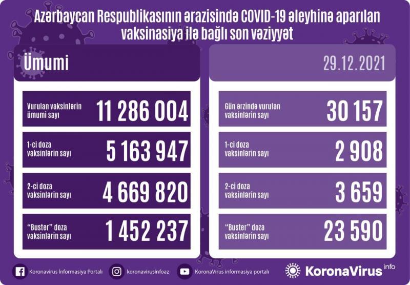 Azərbaycanda son sutkada koronavirus (COVID-19) əleyhinə vurulan peyvəndlərin sayı açıqlanıb. Bir gündə 30 157 vaksin vurulub.