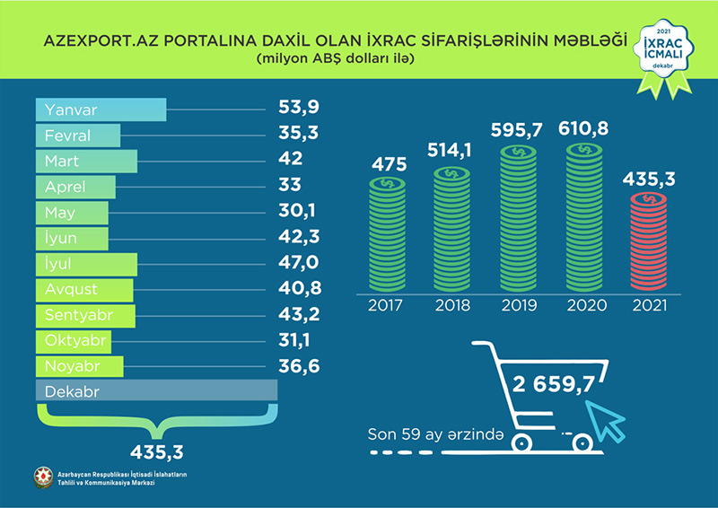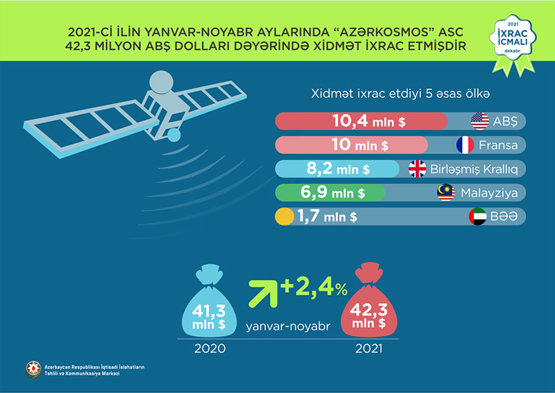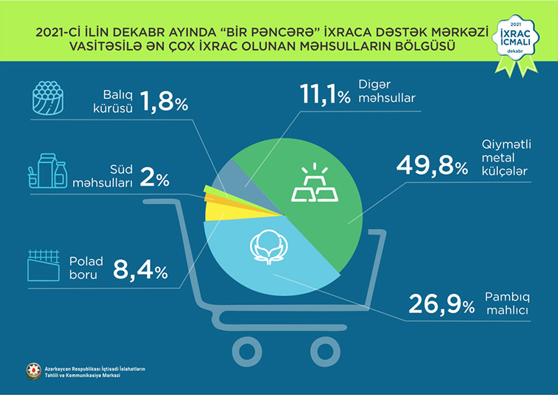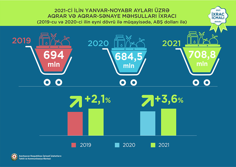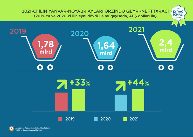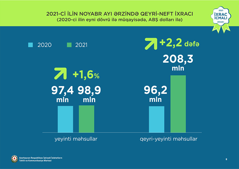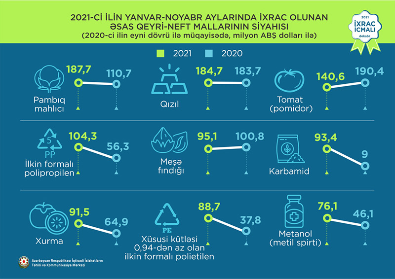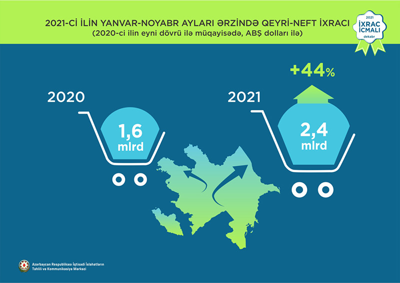 “İxrac icmalı”nın dekabr sayına əsasən, 2021-ci ilin ilk 11 ayı ərzində Azərbaycanın ixracı 19,8mlrd. ABŞ dolları, qeyri-neft sektoru üzrə 2,4 mlrd. ABŞ dolları təşkil edib. Qeyri-neft sektoru üzrə ixrac 2020-ci ilin müvafiq dövrü ilə müqayisədə 720,8 mln. ABŞ dolları və ya 44% artıb. 2021-ci ilin 11 ayı ərzində meyvə-tərəvəz məhsulları ötən ilin eyni dövrü ilə müqayisədə 258,8 min ABŞ dolları artaraq 549,8 milyon ABŞ dolları təşkil edib. Müvafiq dövr ərzində qeyri-neft ixracında pambıq iplik 3,4 dəfə, kimya sənayesi məhsulları 2,7 dəfə, qara metallar və onlardan hazırlanan məmulatlar 2,3 dəfə, pambıq lifi 70,2%, alüminium və ondan hazırlanan məmulatlar 69,3%, şəkərdə isə 29,8% artım qeydə alınıb.