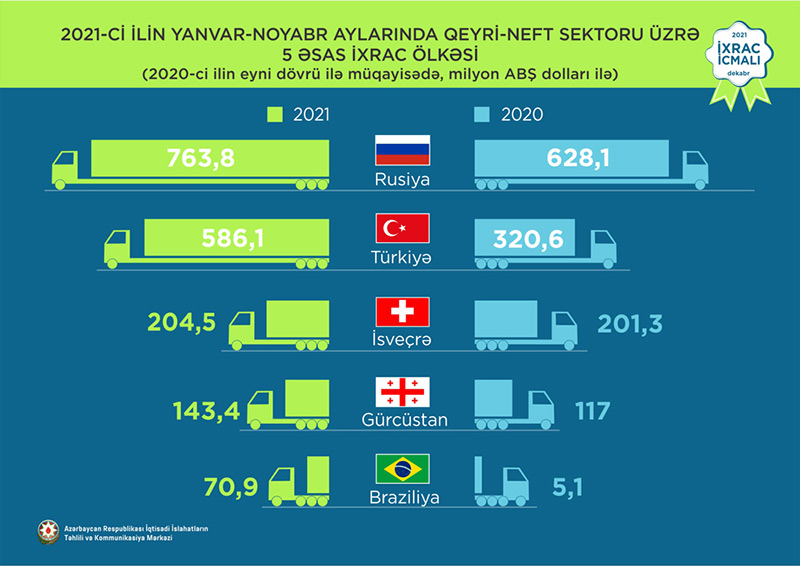 2021-ci ilin yanvar-noyabr ayları ərzində Rusiya Federasiyasına 763,8 milyon ABŞ dolları, Türkiyəyə 586,1 milyon ABŞ dolları, İsveçrə Konfederasiyasına 204,5 milyon ABŞ dolları, Gürcüstana 143,4 milyon ABŞ dolları və Braziliyaya 70,9 milyon ABŞ dolları dəyərində qeyri-neft sektoruna aid mal ixrac olunub.