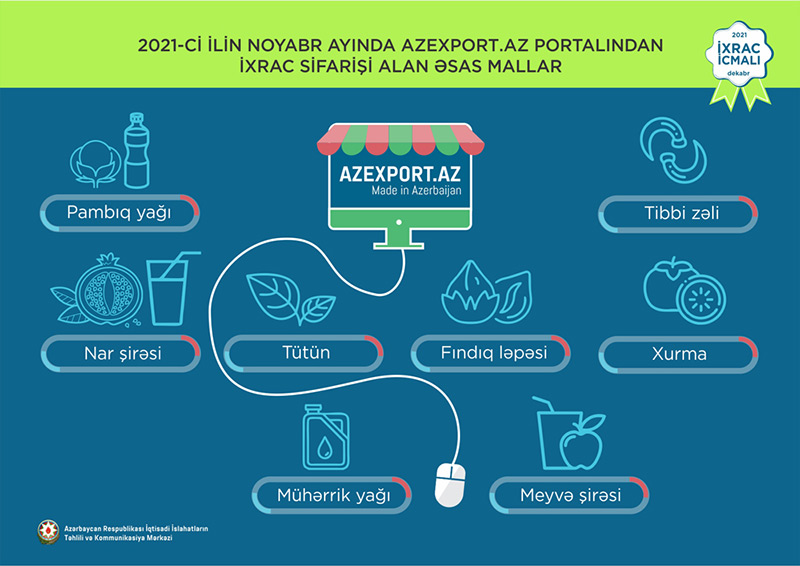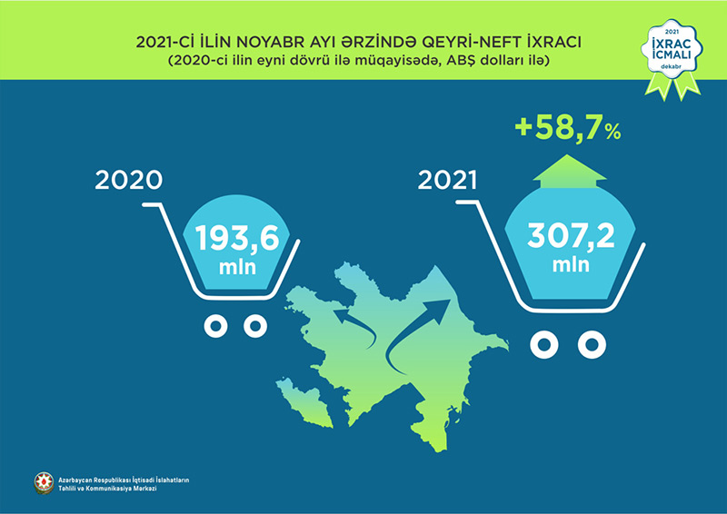 Normallaşma prosesinin davam etdiyi dövrdə noyabr ayı üzrə ixrac 2,95 mlrd ABŞ dolları təşkil edib. Qeyri-neft sektoru üzrə ixracda artım 58,7% təşkil etməklə 307,2 mln ABŞ dolları olub. 2021-ci ilin noyabr ayı ərzində yeyinti məhsulları üzrə ixrac ötən ilin müvafiq ayı ilə müqayisədə 1,6% artaraq 98,9 milyon ABŞ dolları, qeyri-yeyinti məhsulları üzrə isə 2,2 dəfə artaraq 208,3 milyon ABŞ dolları təşkil edib.