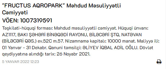 Marja xəbər verir ki, nizamnamə kapitalı 10 min manat olan şirkətin qanuni təmsilçisi Əliyev İqbal Adil oğludur.