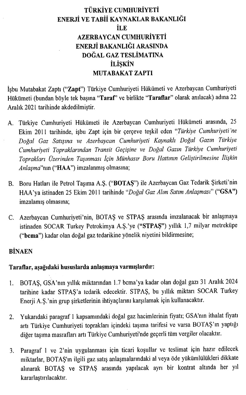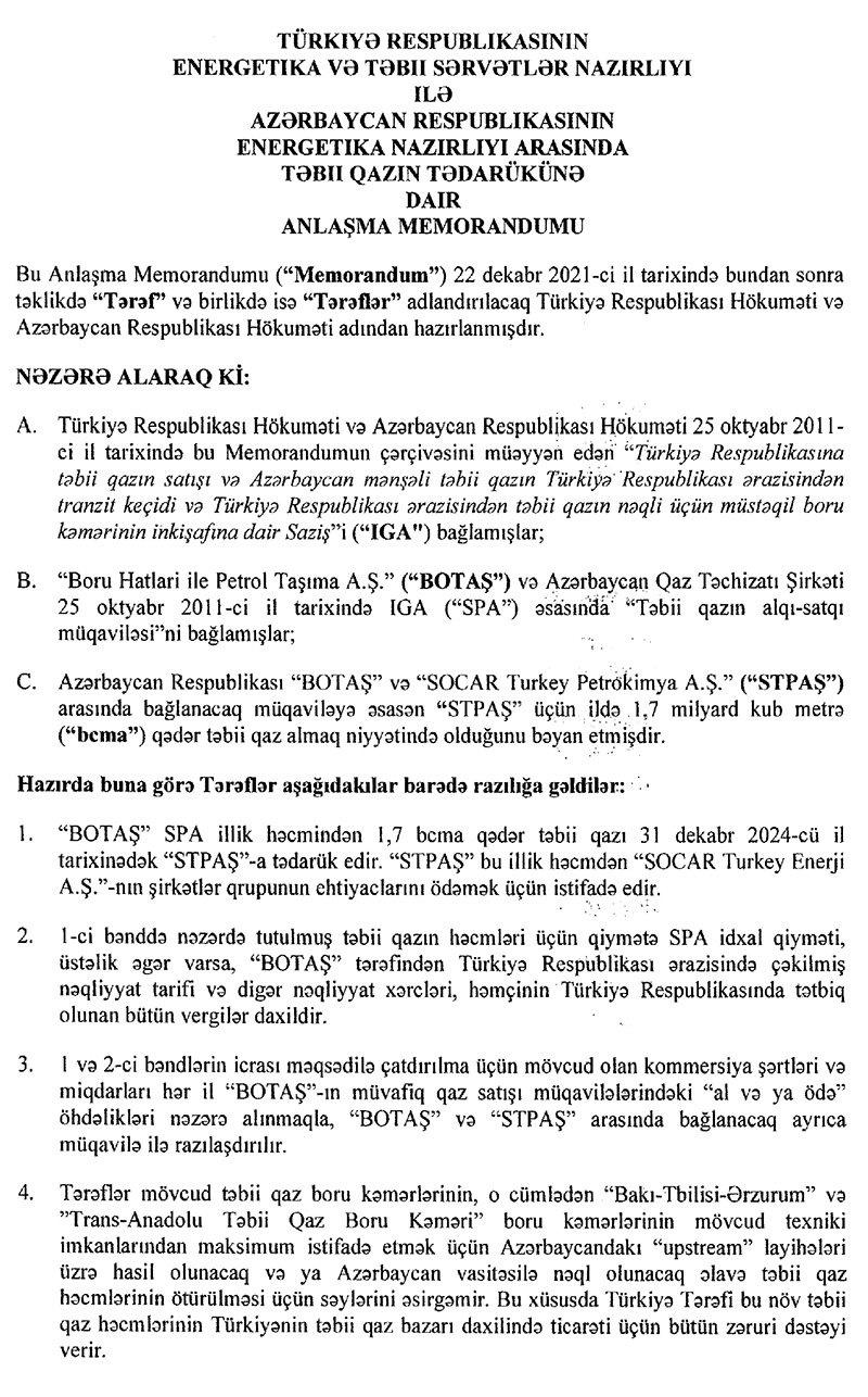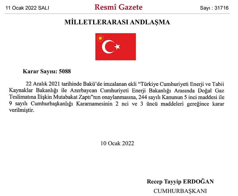 Türkiyə-Azərbaycan qaz anlaşma memorandumu təsdiq edilib, Azərbaycandan alınan 1,7 milyard kubmetr qaz "SOCAR Petrokimya" tərəfindən alınacaq.Dekabrda Türkiyə ilə Azərbaycan arasında imzalanmış təbii qazın tədarükünə dair anlaşma memorandumu Türkiyə Prezident tərəfindən təsdiq edilib.