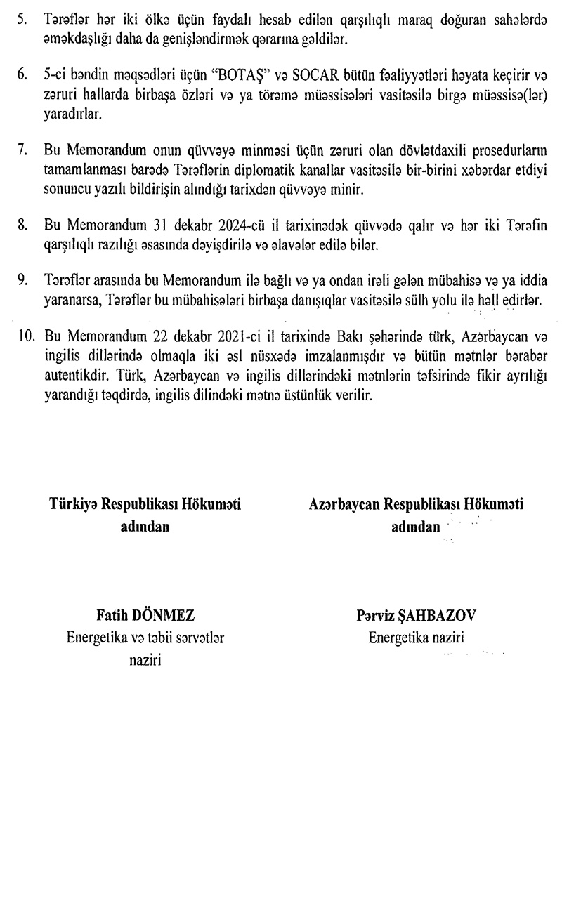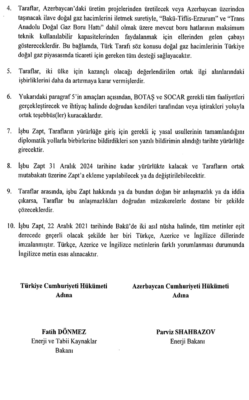 İki ölkə Azərbaycanda hasil ediləcək və ya Azərbaycan ərazisindən ötürüləcək qazın maksimum həcmdə Bakı-Tbilisi-Ərzurum və TANAP boru kəmərləri ilə nəqli üçün lazımi səy göstərəcək. Həmçinin Türkiyə təbii qaz həcmlərinin daxili bazarında ticarəti üçün bütün lazımi dəstəyi verəcək.