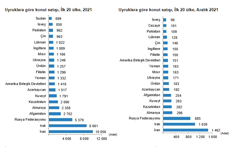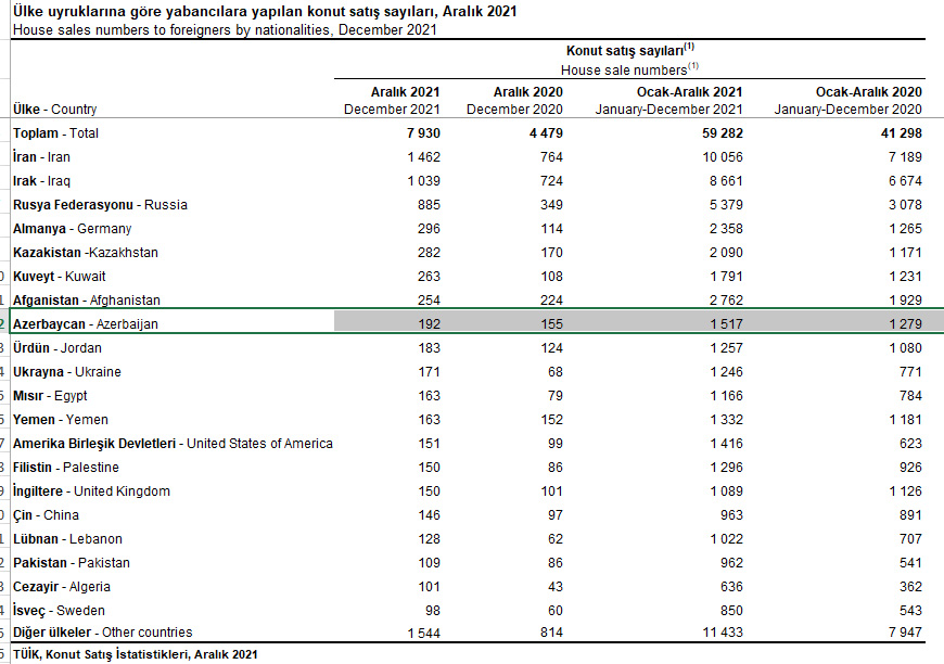 2021-ci ilin yanvar-dekabr aylarında (12 ay ərzində) azərbaycanlılar Türkiyədə 1517 mənzil alıblar. 2020-ci il ildə azərbaycanlılar Türkiyədə 1279 mənzil almışdılar. Təkcə Dekabrda azərbaycanlılar tərəfindən 192 mənzil alınıb. Noyabrda azərbaycanlılar tərəfindən 185 mənzil alınmışdı.