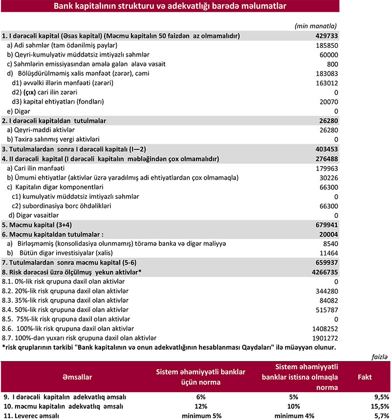 "Kapital Bank" 31 dekabr 2021-ci il tarixində 659 milyon 937 min manat məcmu kapitala malik olub. Bank 31 dekabr 2020-ci il tarixində 536 milyon 800 min manat məcmu kapitala malik idi.