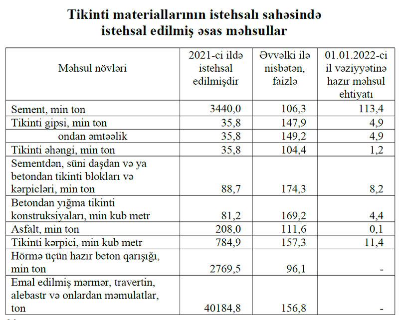 Marja Dövlət Statistika Komitəsinin illik hesabatına istinadən xəbər verir ki, odadavamlı kərpiclər, bloklar, tavalar və oxşar saxsı tikinti məhsullarının istehsal 8,6 dəfə, sementdən, süni daşdan və ya betondan tikinti blokları və kərpiclərinin istehsalı 74,3 faiz, betondan yığma tikinti konstruksiyaların istehsalı 69,2 faiz, emal edilmiş mərmər travertin, alebastr və onlardan məmulatların istehsalı 56,8 faiz, tikinti gipsinin istehsalı 47,9 faiz, tikinti kərpicinin istehsalı 57,3 faiz, sementin istehsalı 6,3 faiz, tikinti əhənginin istehsalı isə 4,4 faiz artıb.