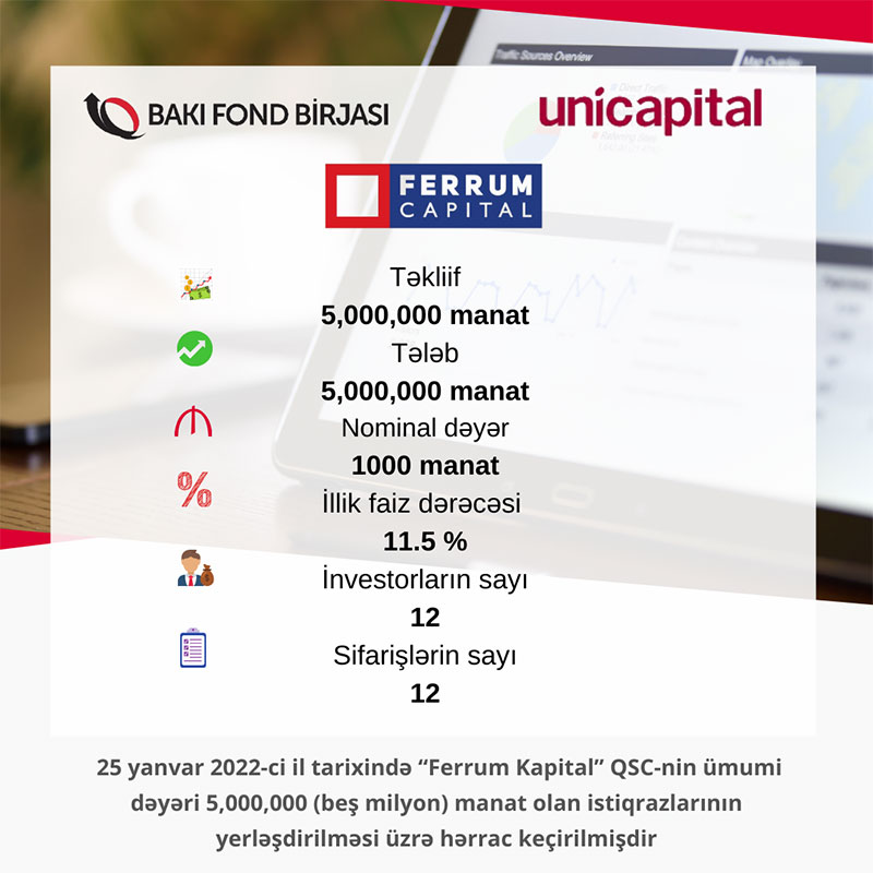 25 yanvar 2022-ci il tarixində Bakı Fond Birjasında “Ferrum Kapital” QSC-nin tədavül müddəti 12 (on iki) təqvim ayı olan AZ2009022289 dövlət qeydiyyat nömrəli, 5 milyon manat həcmində, faizli, təmin edilməmiş sənədsiz, adlı istiqrazlarının yerləşdirilməsi üzrə hərrac yekunlaşıb.