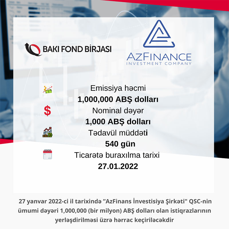 Birjanın yaydığı məlumata görə, 27 yanvar 2022-ci il tarixində “AzFinance İnvestisiya Şirkəti” QSC-nin istiqrazlarının yerləşdirilməsi Bakı Fond Birjasında rəqabətli hərrac üsulu ilə həyata keçiriləcəkdir.
