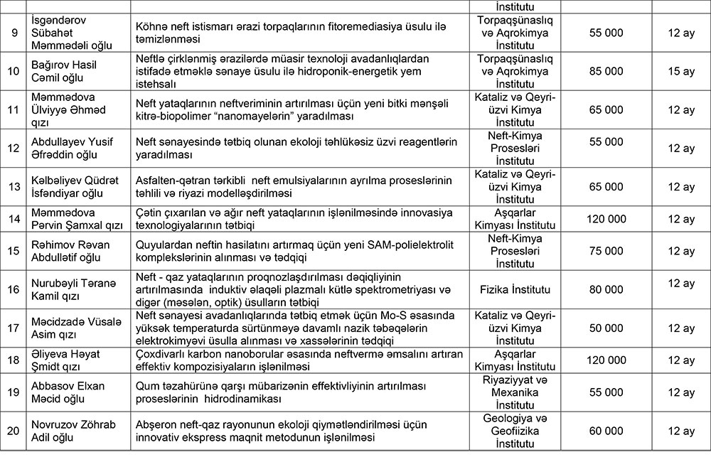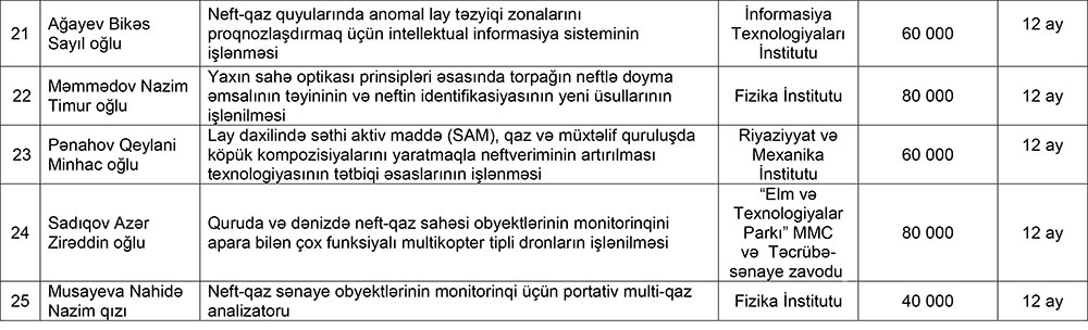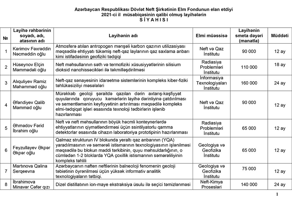 Müsabiqə Komissiyasının və ekspertlərin yekun rəyləri nəzərə alınaraq, SOCAR-ın Elm Fondunun İdarə Heyətinin 5 yanvar 2022-ci il tarixli qərarı ilə 25 elmi tədqiqat qrant layihəsi müsabiqənin qalibi elan olunub.