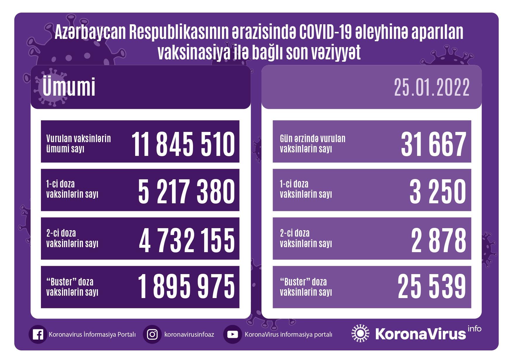 Azərbaycanda son sutkada koronavirus (COVID-19) əleyhinə 31 667 vaksin vurulub. Bir gündə birinci mərhələ üzrə vaksinasiya olunanların sayı 3 250, ikinci mərhələ üzrə vaksinasiya olunanların sayı 2 878, buster doza üzrə vaksinasiya olunanların sayı isə 25 539 nəfərdir.