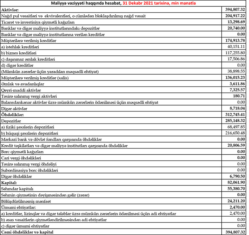 Bankın aktivləri 2021-ci il ərzində artaraq 395 milyon manat olmuşdur. 2021-ci ilin dördüncü rübündə I dərəcəli kapitalın adekvatlıq əmsalı 33%-ə, məcmu kapitalının adekvatlıq əmsalı isə 34%-ə çatmışdır. Nəticə etibarilə, bankın kapital adekvatlığı göstəriciləri tənzimləyici orqanın müəyyən etdiyi normalardan əhəmiyyətli dərəcədə yüksək olmuşdur. Qeyd edək ki, Mərkəzi Bankın tələblərinə görə məcmu kapitalın adekvatlılıq əmsalı minimum 10% olmalıdır.