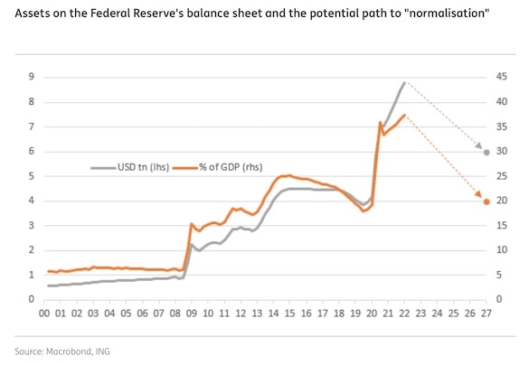 Analitiklər bildirirlər ki, FED-in balansı 6 trilyon dollara qədər azalacaq və ABŞ ÜDM-nin 20%-nə bərabər olacaq (hazırda ÜDM-in 36%-nə qarşı).