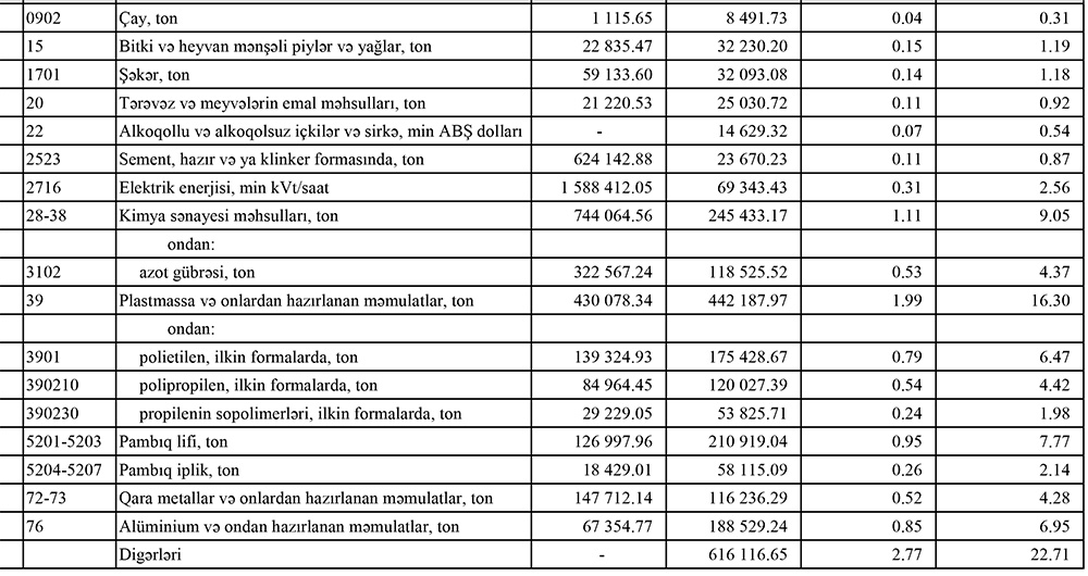 Neft-qaz sektoruna daxil olmayan mallar üzrə ixracın böyük hissəsini - 630 milyon 368 min dollarını meyvə-tərəvəz, 442 milyon 188 min dollarını plastmassa və onlardan hazırlanan məmulatlar, 245 milyon 433 min dollarını kimya sənayesi məhsulları, 210 milyon 919 min dollarını pambıq lifi, 188 milyon 529 min dollarını alüminium və ondan hazırlanan məmulatlar, 116 milyon 236 min dollarını qara metallar və onlardan hazırlanan məmulatlar ixracı təşkil edib.