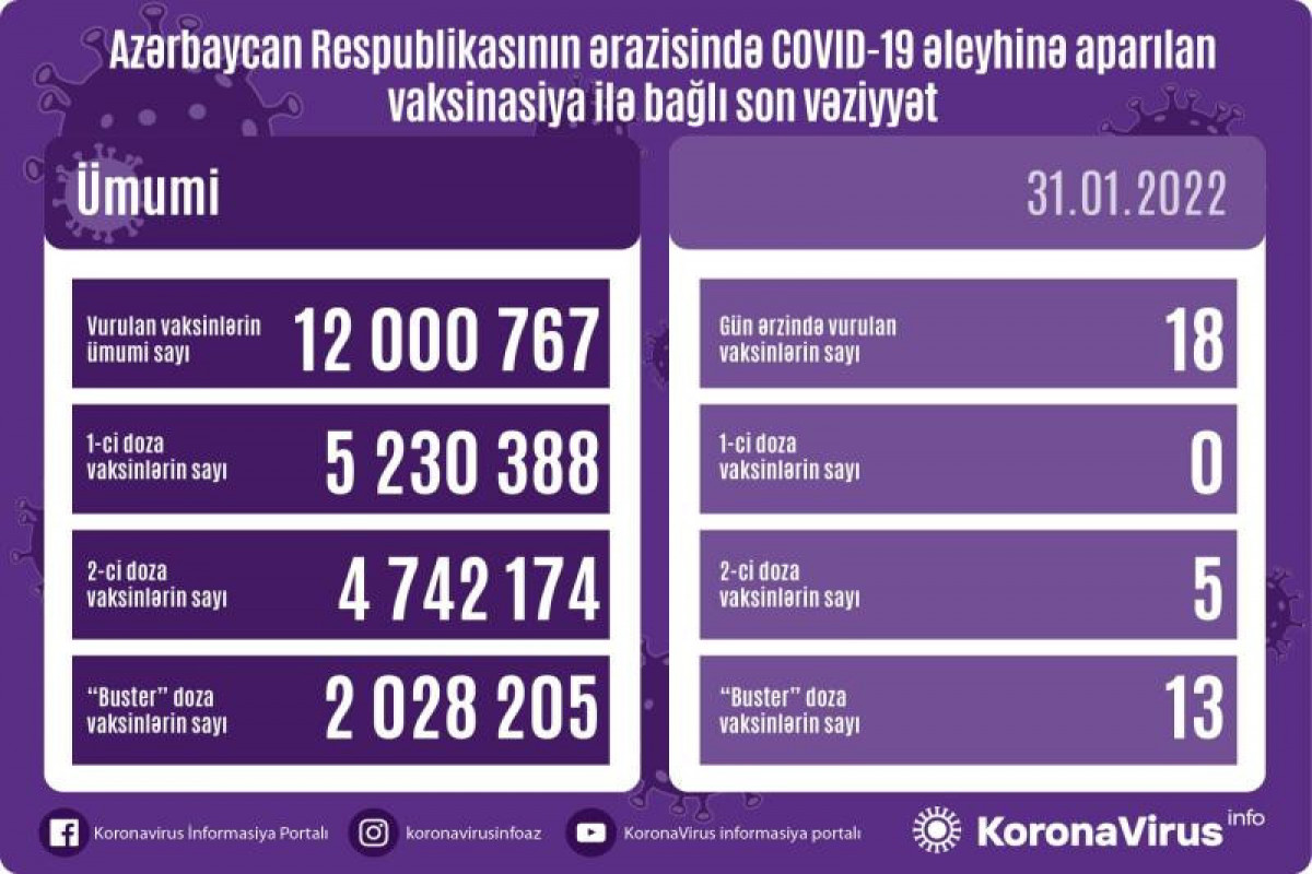 Azərbaycanda son sutkada koronavirus (COVID-19) əleyhinə 18 vaksin vurulub.