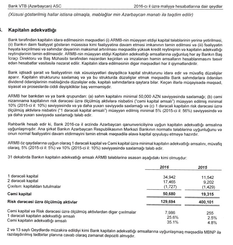 “VTB Bank Azərbaycan” ASC-nin 2016-cı il üzrə audit hesbatına görə, Bank ötən ili 141 milyon manat zərər ilə başa vurmasına, cəmi balans kapitalının -128 milyon 237 manata düşməsinə baxmayaraq, məcmu kapital 50 milyon 680 min manat təşkil edib.