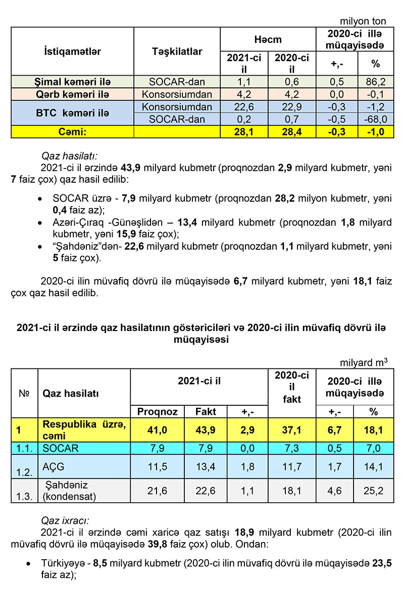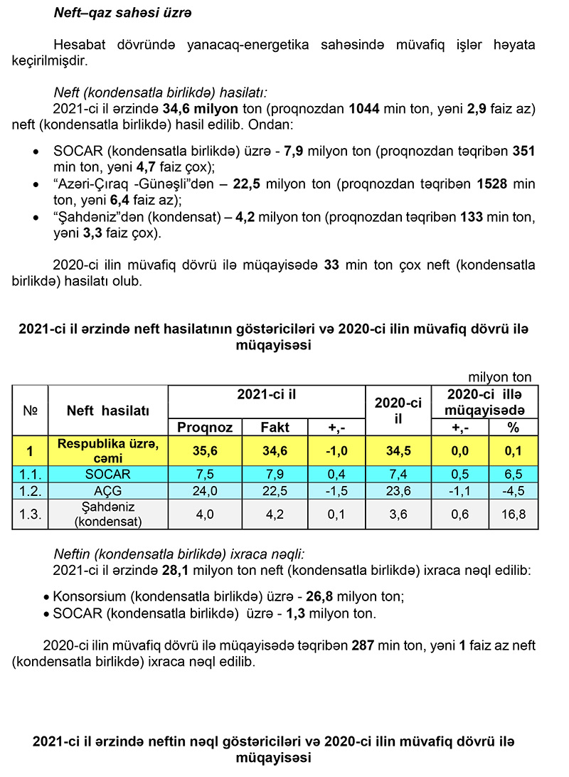 2021-ci il ərzində 34,6 milyon ton (proqnozdan 1044 min ton, yəni 2,9 faiz az) neft (kondensatla birlikdə) hasil edilib, 28,1 milyon ton neft (kondensatla birlikdə) ixraca nəql edilib.