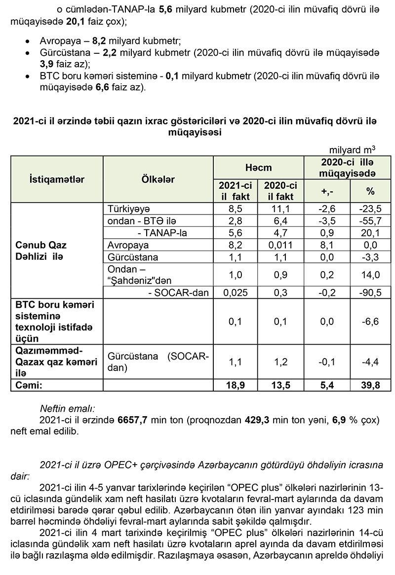 Marja Energetika Nazirlinin yaydığı məlumata istinadən xəbər verir ki, 2021-ci il ərzində 43,9 milyard kubmetr (proqnozdan 2,9 milyard kubmetr, yəni 7 faiz çox) qaz hasil edilib, bu da 2020-ci ilin müvafiq dövrü ilə müqayisədə 6,7 milyard kubmetr, yəni 18,1 faiz çoxdur.