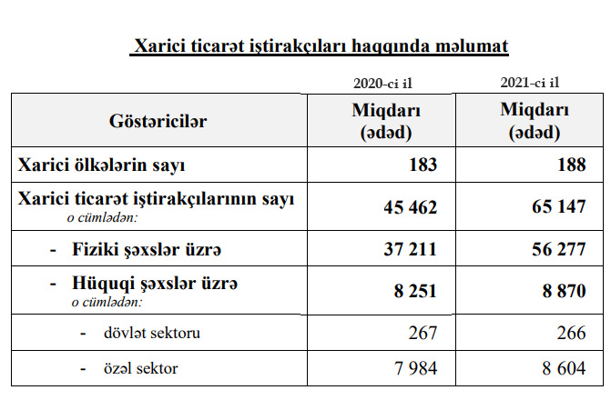 Xarici ticarət iştirakçılarının sayı 2020-ci illə müqayisədə 2021-ci ildə 19 min 685 şəxs artaraq 65 min 147 şəxs təşkil edib. 2020-ci ildə xarici ticarət iştirakçılarının sayı 45 min 462 şəxs olmuşdu. Artımın böyük hissəsi ticarət ilə məşğul olan fiziki şəxslərin sayının artmasından qaynaqlanır.