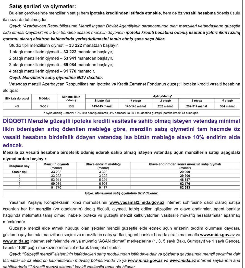 Mənzil İnşaatı Dövlət Agentliyinin növbəti layihəsi - Yasamal Yaşayış Kompleksinin ikinci mərhələsi üzrə mənzillərin güzəştlə satışına başlanılır.