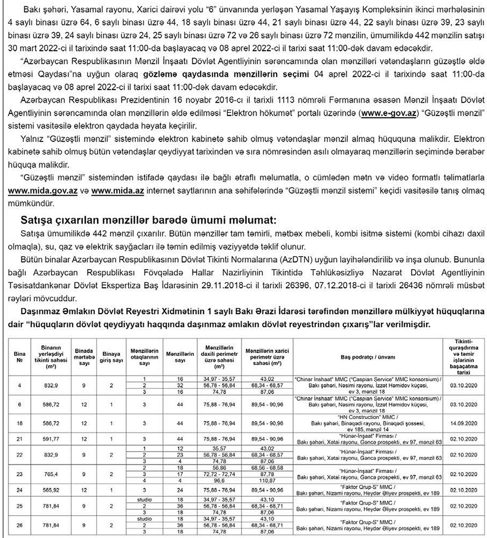 Marja.az xəbər verir ki, ümumilikdə 442 mənzilin satışı 30 mart 2022-ci il tarixində saat 11:00-da başlayacaq, 8 aprel 2022-ci il tarixində saat 11:00-da başa çatacaqdır.