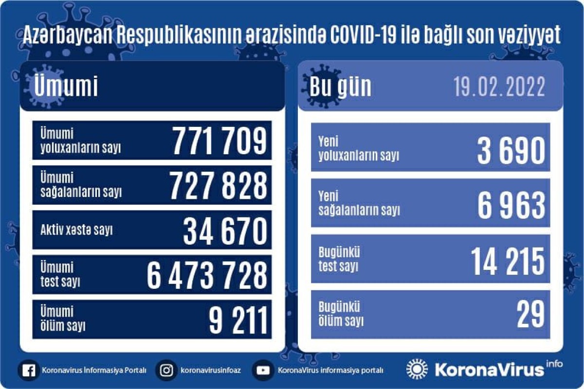 Xatırladaq ki, 18 Fevral 2022-ci il tarixində 3817 yoluxma faktı və 25 ölüm qeydə alındığı açıqlanmışdı. 09 Fevral 2022-ci il tarixində açıqlanmış fakt (7779) bugünədək qeydə alınmış ən yüksək günlük yoluxma sayıdır.