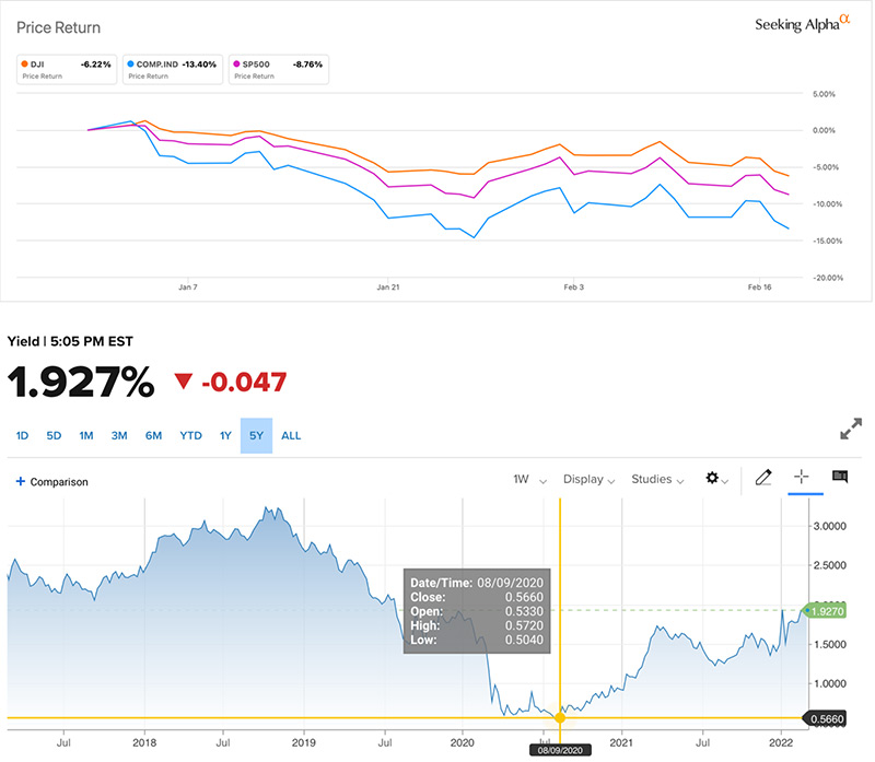 İnsanları ən çox narahat edən məsələlərdən biri də yığımlarının belə sürətli inflyasiya şəraitində dəyərdən düşməsidir. Belə ki, inflyasiya şəraitində Mərkəzi Bankların artım istiqamətindəki faiz qərarları dövlət istiqrazları başda olmaqla sabit gəlirli maliyyə alətlərində gəlirliliyi artırsa da, bu gəlirlər inflyasiyanı belə qarşılamır. Digər tərəfdən artan faizlər səhm bazarının ucuzlaşmasına gətirib çıxarır ki, bu da yığımların inflyasiyaya qarşı dəyər artımından qorunmaq üçün effektiv görünmür. Məsələn 10 illik ABŞ Dövlət istiqrazları 2020-ci ilin ortalarında 0.53% ətrafında ticarət olunurdusa, hazırda gəlirlilik 1.93%-ə qalxıb. Amma nəzərə almaq lazımdır ki, ABŞ-da yanvar inflyasiya göstəricisi illik 7.5% olub. Görüdüyünüz kimi, gəlirliliklər kifayət qədər aşağıdır. İlin əvvəlindən bugünə SP500 səhm indeksi 9.3%, NASDAQ 15%-dən çox, Dow Jones Sənaye indeksi isə 7.3% düşüb.