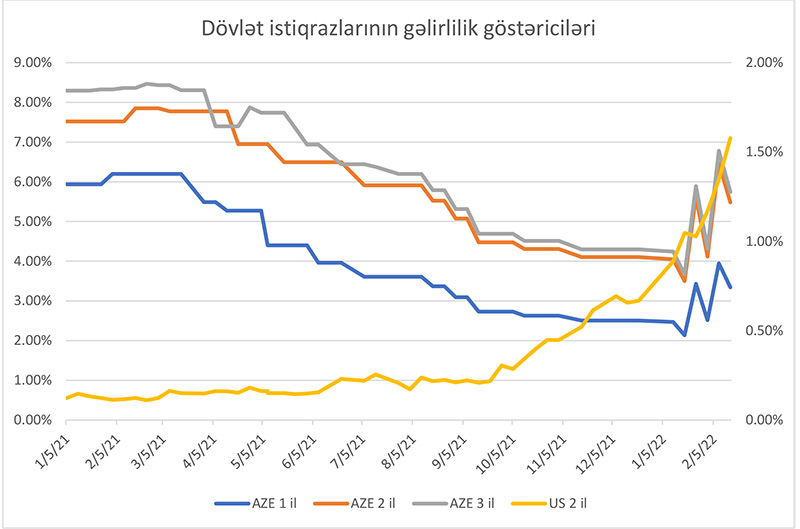 Azərbaycanda hazırda baş verənləri anomaliya hesab etmək olar. Belə ki, Mərkəzi Bank pandemiya dövründə azalan iqtisadi aktivliyin artırılması məqsədi ilə aşağı saldığı uçot dərəcəsini 2021-ci il oktyabr ayında inflyasiyanın da sürətlənməsi ilə 6.25%-dən yuxarı artırmağa başladı. Ard-arda verilən faiz qərarları ilə uçot dərəcəsi 2022-ci ilin yanvar ayında 7.5%-ə çatdırıldı. Mərkəzi Bankın keçən ilin oktyabr ayından etibarən uçot faiz dərəcəsini artırmağa başlamasına baxmayaraq, 2022-ci ilin yanvar ayının sonunadək bazar bu xəbərə əks reaksiya vermişdir. Belə ki, həm Mərkəzi Bankın monetar siyasət aləti olan notlarda, həm də dövlət istqirazlarında olan gəlirliliklərdə may ayından başlayan azalma olduğu kimi davam etmişdir və 2 illik dövlət istiqrazlarının gəlirliliyi ilin əvvəlindəki 7.52% səviyyəsindən 3.5%-ə qədər enmişdir. Yalnız Mərkəzi Bankın son faiz artımı qərarından sonra keçirilən hərraclarda gəlirlilik volatil olmuş və hazırda 5.48%-də qərarlaşmışdır. Mərkəzi Bankın notlarında gəlirlilik isə nisbətən sabit olmuşdur. Keçən ilin sentyabr ayından etibarən Mərkəzi Bank notları üzrə gəlirlilik ortalama 6.01% olmuşdur. Müqayisə üçün deyim ki, 2 illik ABŞ Dövlət istiqrazlarının gəlirliliyi eyni dövrdə 0.12%-dən 1.58%-ə qalxmışdır.