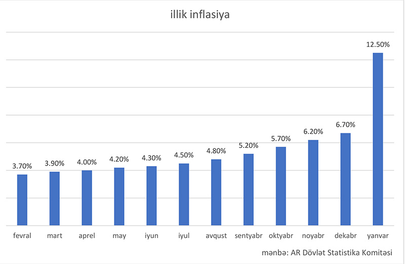 Azərbaycanda Dövlət Statistika Komitəsi istehlak bazarında qiymətlərin dəyişməsi haqqında 2022-ci ilin yanvar ayında 2021-ci ilin yanvar ayına nisbətdə 12.5% artım elan edib. Əsas bahalaşma isə 17.5% ilə qida məhsullarında qeydə alınıb. 2021-ci ilin əvvəllərində bu göstərici illik 3.7% səviyyələrində idisə, oktyabr - dekabr aylarında illik 6-7%-ə qədər artıb. Yanvar ayında 12.5%-lik göstərici inflyasiyanın təkcə artdığını yox, həm də inflyasiyanın artım tempinin də yüksəldiyini göstərir.