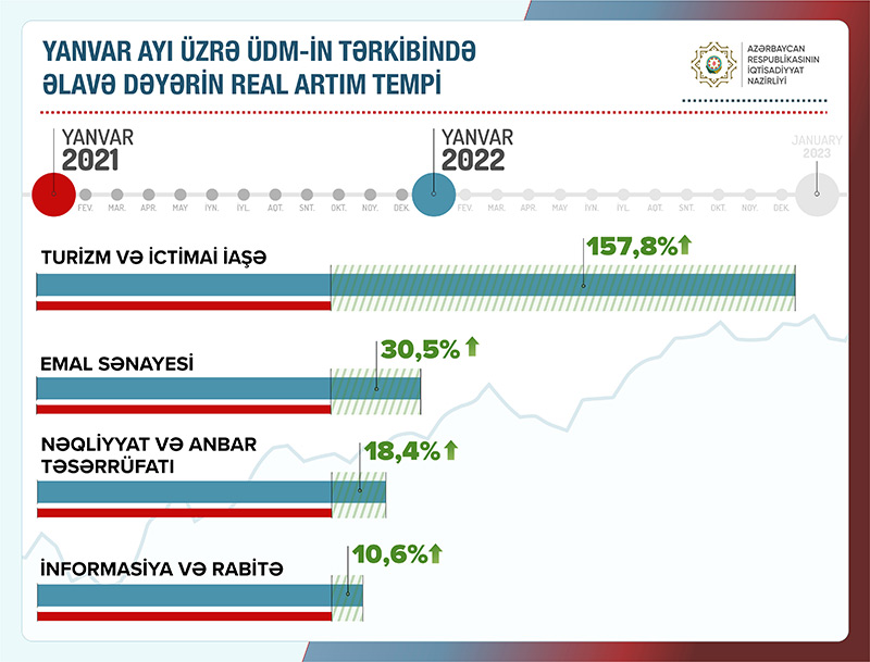 Nazir əlavə edib ki, yanvar ayı üzrə ÜDM-in tərkibində əlavə dəyərin real artımı, əsasən, turizm, ictimai iaşə, emal sənayesi, nəqliyyat, informasiya və rabitə sahələrində olub. Bu sektorlarda ötən ilin müvafiq dövrü ilə müqayisədə yüksək dinamika qeydə alınıb.