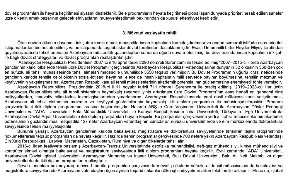 "Marja" xəbər verir ki, sərəncamla “Gənclərin xarici ölkələrin nüfuzlu ali təhsil müəssisələrində təhsil almalarına dair 2022–2026-cı illər üçün Dövlət Proqramı” təsdiq edilib.