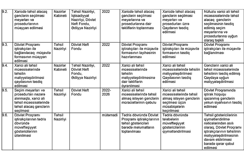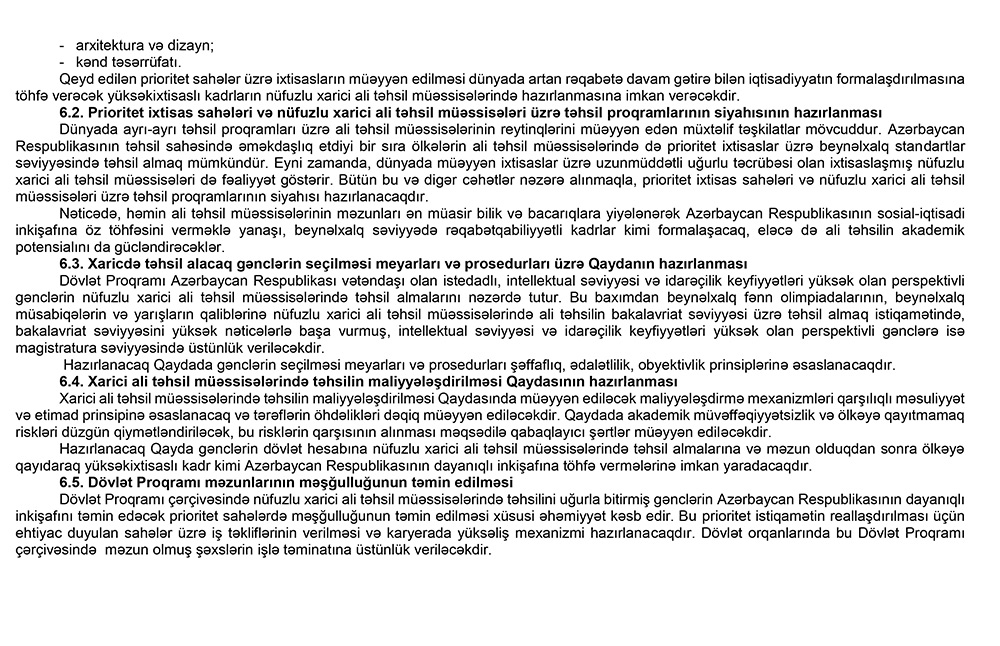 Gənclərin xarici ölkələrin nüfuzlu ali məktəblərində təhsil almalarına dair Dövlət Proqramı təsdiq edildiPrezident İlham Əliyev “Gənclərin xarici ölkələrin nüfuzlu ali təhsil müəssisələrində təhsil almalarına dair 2022–2026-cı illər üçün Dövlət Proqramı”nın təsdiq edilməsi haqqında sərəncam imzalayıb.