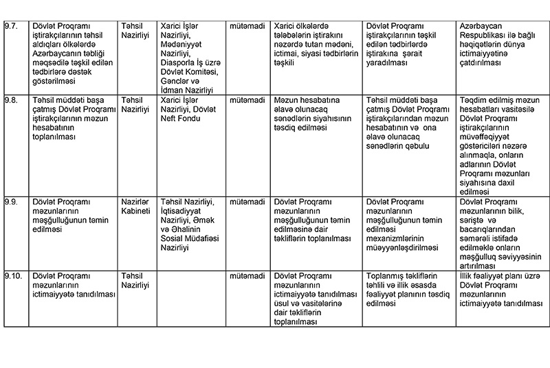 Dövlət Proqramında nəzərdə tutulmuş tədbirlərin icrasının monitorinqini və qiymətləndirilməsini Təhsil Nazirliyinin sifarişi əsasında İqtisadiyyat Nazirliyi həyata keçirəcək.