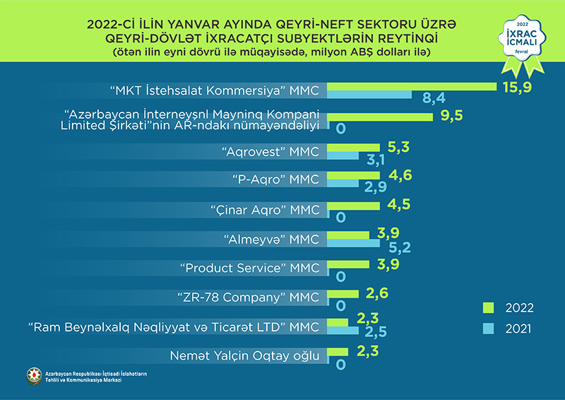 2022-ci ilin yanvar ayı üzrə hazırlanan qeyri-dövlət ixracatçı subyektlərin reytinqində ilk onluqda aşağıdakı şirkətlər təmsil olunurlar: