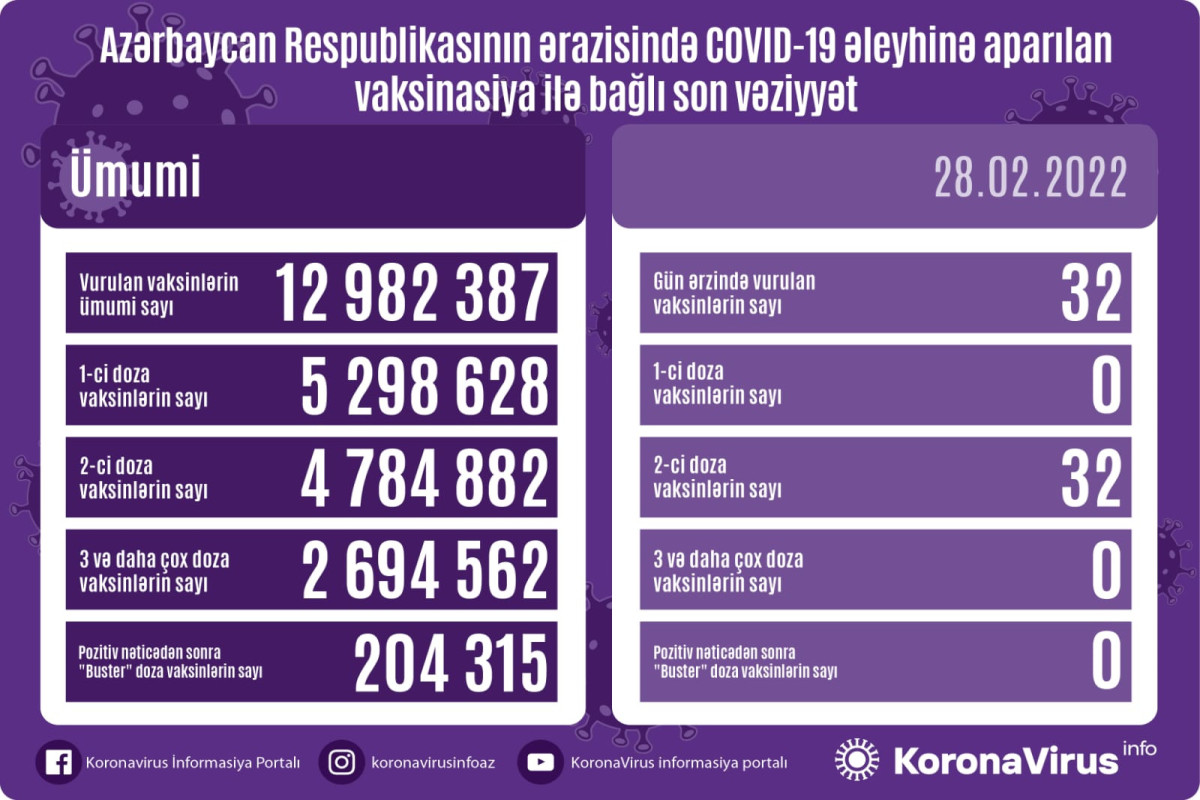 Azərbaycanda son sutkada koronavirus (COVID-19) əleyhinə 32 vaksin vurulub. Bir gündə birinci mərhələ üzrə vaksinasiya olunanların sayı 0, ikinci mərhələ üzrə vaksinasiya olunanların sayı 32, 3 və daha çox doza üzrə vaksinasiya olunanların sayı 0, pozitiv nəticədən sonra buster doza olunanların sayı isə 0 nəfərdir.