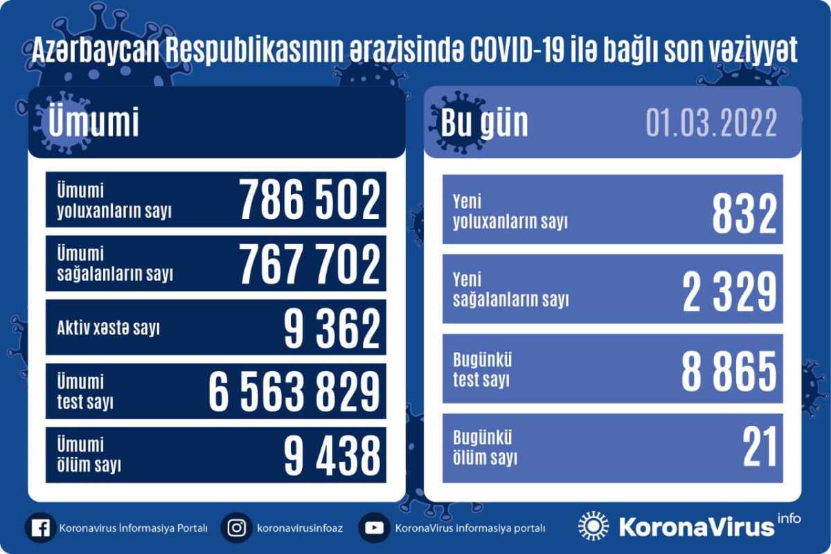 Azərbaycan Respublikasında koronavirus (COVID-19) infeksiyasına 832 yeni yoluxma faktı qeydə alınıb, 2 329 nəfər müalicə olunaraq sağalıb.