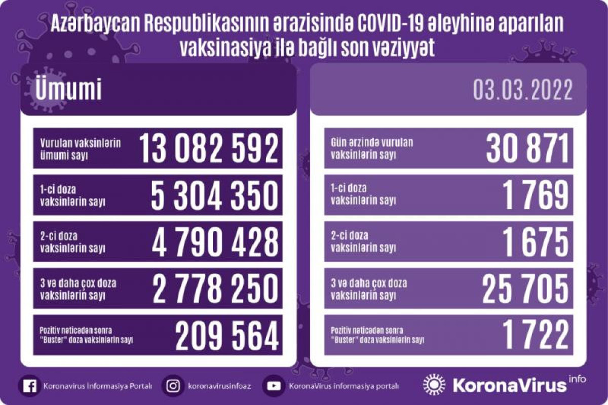 Azərbaycanda son sutkada koronavirus (COVID-19) əleyhinə 30 871 vaksin vurulub. Bir gündə birinci mərhələ üzrə vaksinasiya olunanların sayı 1769, ikinci mərhələ üzrə vaksinasiya olunanların sayı 1675, üç və daha çox doza üzrə vaksinasiya olunanların sayı 25 705, pozitiv nəticədən sonra buster doza üzrə vaksinasiya olunanların sayı 1722 nəfərdir.