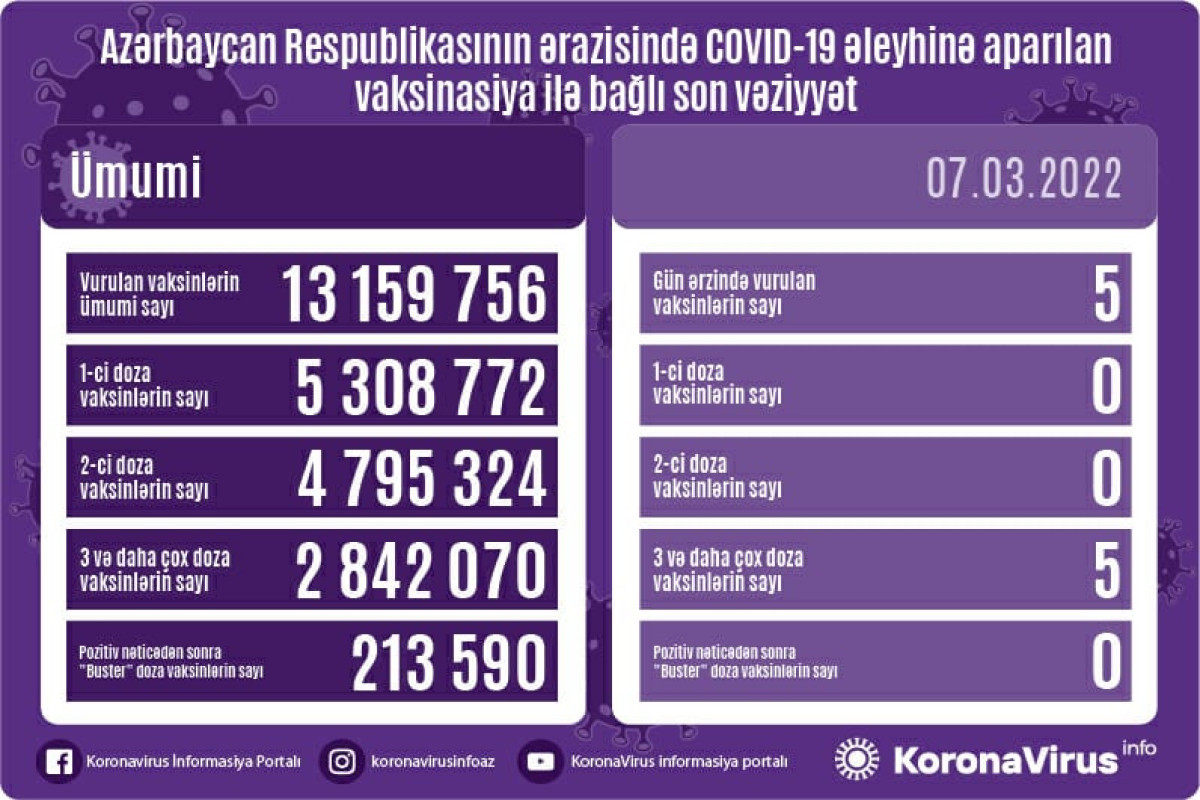 Azərbaycanda son sutkada koronavirus (COVID-19) əleyhinə 5 vaksin vurulub. Bir gündə birinci mərhələ üzrə vaksinasiya olunanların sayı 0, ikinci mərhələ üzrə vaksinasiya olunanların sayı 0, 3-cü və daha çox doza üzrə vaksinasiya olunanların sayı 5, pozitiv nəticədən sonra buster doza olunanların sayı isə 0 nəfərdir.