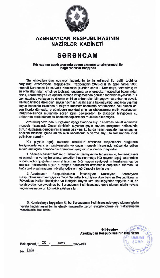 Baş nazir Əli Əsədov “Kür çayının aşağı axarında suyun axınının tənzimlənməsi ilə bağlı tədbirlər haqqında” sərəncam imzalayıb.