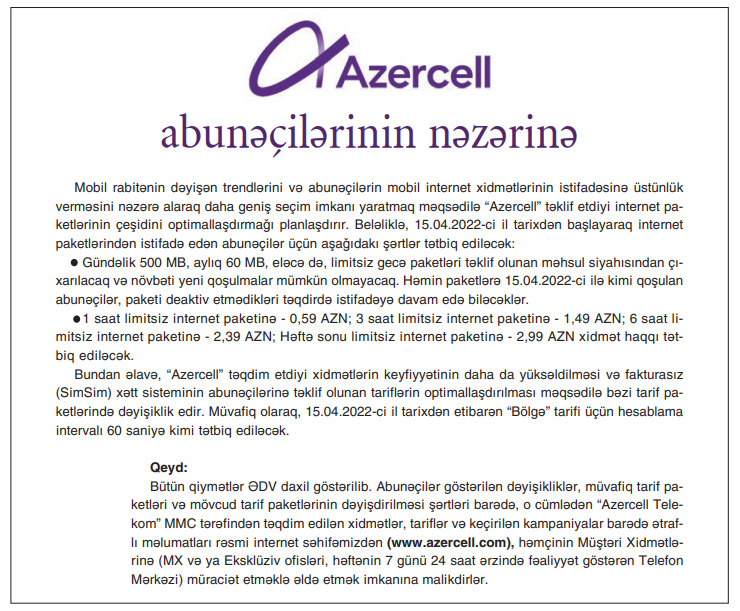 · Gündəlik 500 MB (qiyməti 1.20 AZN), aylıq 60 MB, eləcə də, limitsiz gecə (qiyməti 2 AZN) paketləri təklif olunan məhsul siyahısından çıxarılacaq və növbəti yeni qoşulmalar mümkün olmayacaq. Həmin paketlərə 15.04.2022-ci ilə kimi qoşulan abunəçilər, paketi deaktiv etmədikləri təqdirdə istifadəyə davam edə biləcəklər.