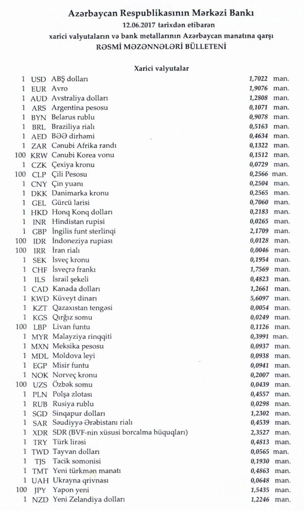 İyunun 12-nə Mərkəzi Bankın açıqladığı rəsmi Dollar/manat məzənnəsi İyunun 9-u ilə müqayisədə dəyişməyərək 1,7022 manat olub, Avro/manat məzənnəsi də 1.9076 manada qalıb.