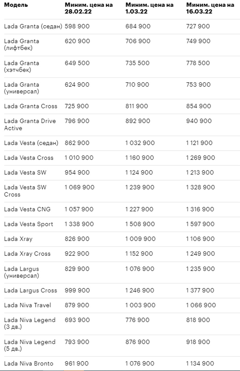 "Granta" hələ də ən sərfəli Lada modelidir. Bu avtomobili almaq istəyənlər minimum 727 900 rubl ödəməli olacaqlar (fevralda qiymətlər 598 900 rubldan başlayırdı). AvtoVAZ-ın ən populyar avtomobili - "Lada Vesta" alıcılara 1 121 900 rubla başa gələcək. Bu Ladanın "Vesta Sport" modelinin idman versiyası hazırda 1.597.900 rubla başa gəlir.
