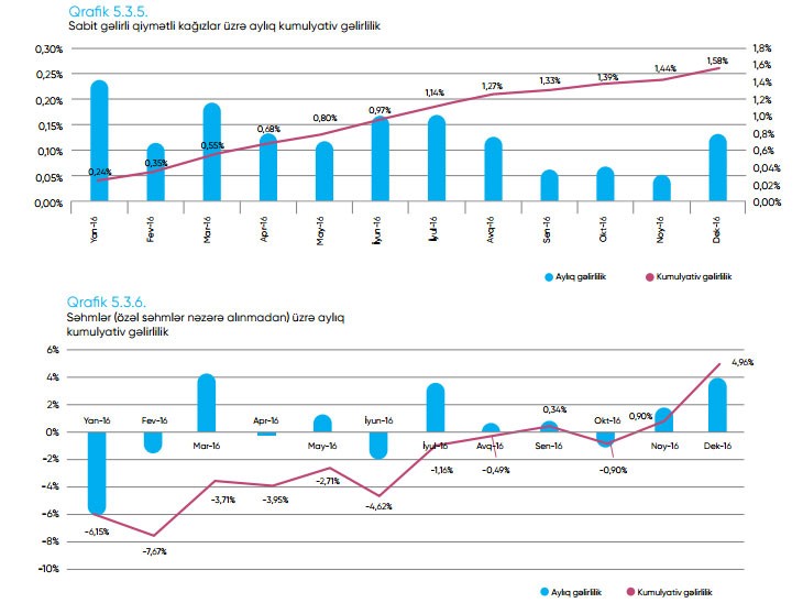 Hesabatda qeyd edilir ki, 2016-cı ildə sabit gəlirli qiymətli kağızlar portfeli üzrə illik gəlirlilik 1,58%, səhm portfeli (özəl səhmlər daxil olmaqla) üzrə 3,65%, daşınmaz əmlak portfeli üzrə isə 2,75% təşkil etmişdir. İnvestisiya portfelinin toplam gəlirliliyinə (1,92%) sabit gəlirli qiymətli kağızlar portfelinin töhfəsi 1,27%, səhm (özəl səhmlər daxil olmaqla) və daşınmaz əmlak portfellərinin töhfəsi isə müvafiq olaraq 0,51% və 0,14% təşkil etmişdir.