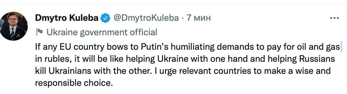 Ukraynanın xarici işlər naziri Dmitri Kuleba Avropa İttifaqı (Aİ) ölkələrini Rusiyanın tələblərinə əməl etməməyə, qaz və neftin pulunu rublla ödəməməyə çağırıb.