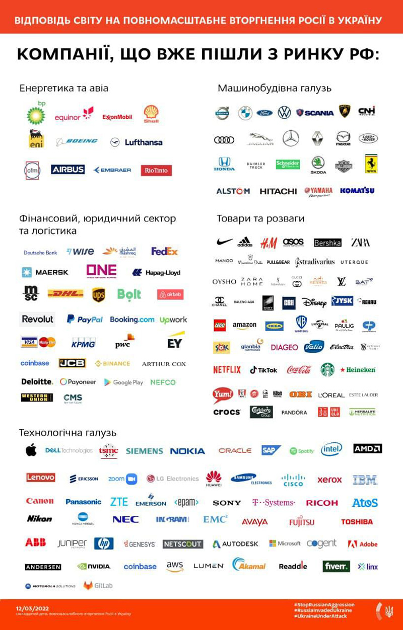 Xüsusən onların arasında “Shell”, “Lufthansa”, “Airbus” (energetika, aviasiya), “Mercedes-Benz”, BMW, “Skoda Auto as”, “Audi” (avtomobilqayırma), “Bolt”, “Google Pay”, “Mastercard”, “Visa”, “Western Union” (maliyyə, hüquq mərkəzi, logistika), “Adidas”, “Puma”, “Nike”, “Disney” (mal və əyləncə), “Netflix”, “Apple”, “Spotify”, “Microsoft” (texnologiya sənayesi) və digərləri var.