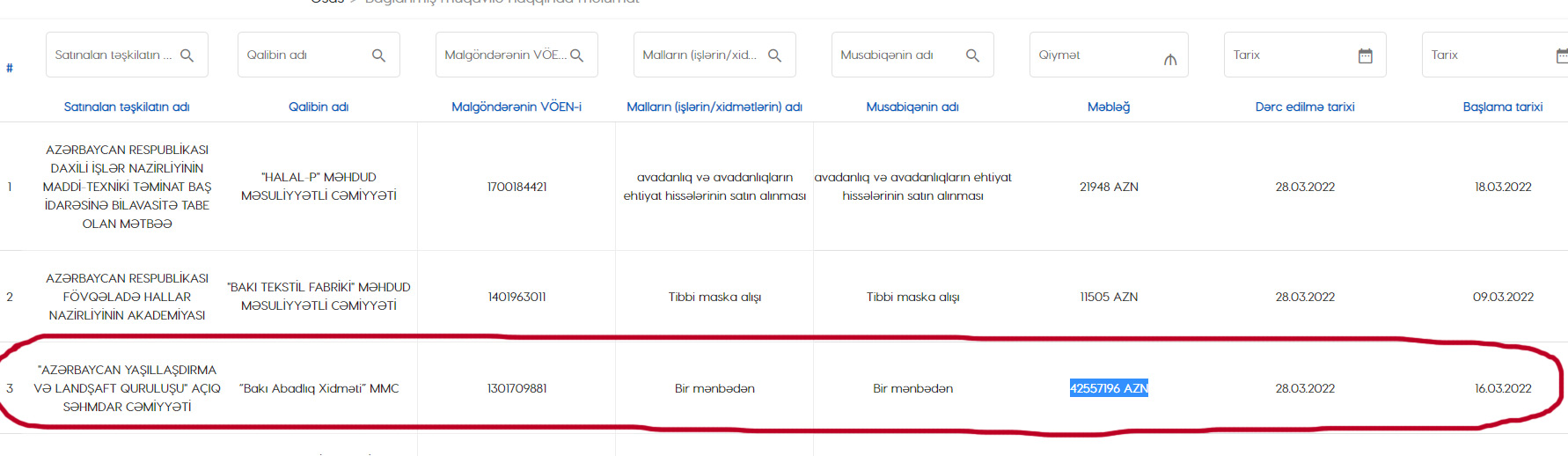 "Azərbaycan Yaşıllaşdırma və Landşaft Quruluşu" qalib şirkət ilə məbləği 42 milyon 557 min 196 manat olan müqavilə imzalayıb.