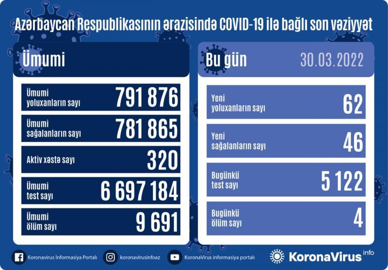 Azərbaycanda daha 62 nəfər koronavirusa yoluxub, 4 nəfər ölüb.Azərbaycanda koronavirus (COVID-19) infeksiyasına 62 yeni yoluxma faktı qeydə alınıb, 46 nəfər müalicə olunaraq sağalıb.