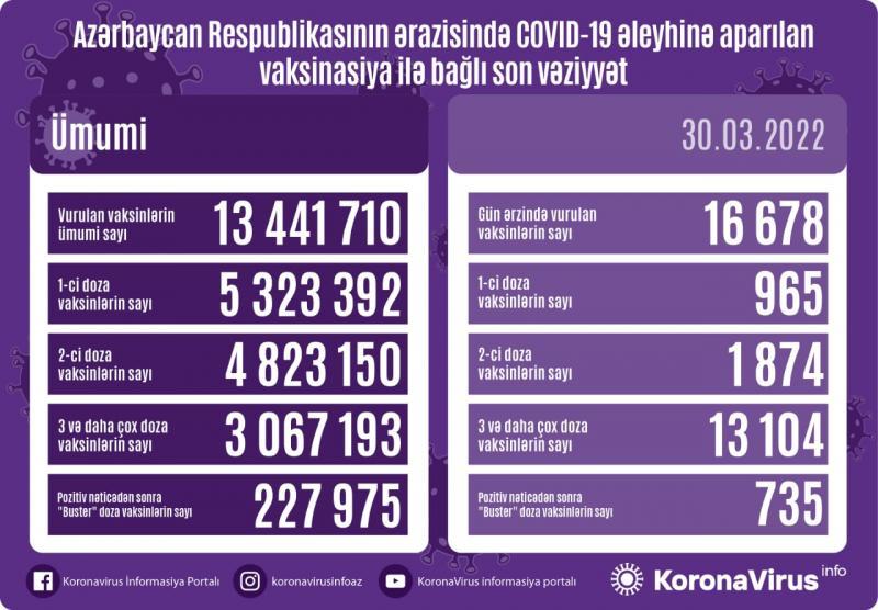 Azərbaycanda son sutkada koronavirus (COVID-19) əleyhinə 16 678 vaksin vurulub. Bir gündə birinci mərhələ üzrə vaksinasiya olunanların sayı 965, ikinci mərhələ üzrə vaksinasiya olunanların sayı 1 874, üç və daha çox doza üzrə vaksinasiya olunanların sayı 13 104, pozitiv nəticədən sonra buster doza üzrə vaksinasiya olunanların sayı 735 nəfərdir.