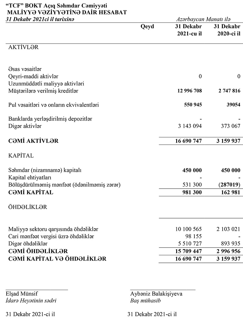 Marja xəbər verir ki, 2020-ci illə müqayisədə təşkilatın xalis mənfəəti 9,3 dəfə artıb. "TCF" BOKT 2020-ci ili 88 min 293 manat xalis mənfəət ilə bağlamışdı.
