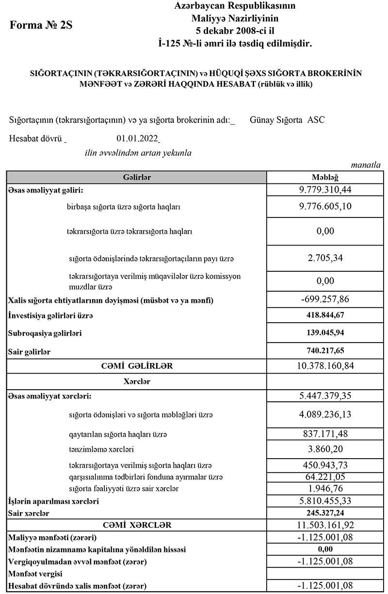 “Günay Sığorta” ASC 2021-ci ili 1 milyon 125 min manat xalis zərər ilə başa vurub. Xatırladaq ki, “Günay Sığorta” şirkəti 2020-ci ili 325 min manat xalis mənfəət ilə bağlamışdı. Xalis zərərin səbəbləri - sığorta ödənişlərinin kəskin artması qaytarılan sığorta haqları və işlərin aparılması üzrə xərclərin artmasıdır.