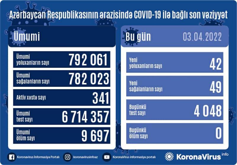 Azərbaycan Respublikasında koronavirus (COVID-19) infeksiyasına 42 yeni yoluxma faktı qeydə alınıb, 49 nəfər müalicə olunaraq sağalıb.